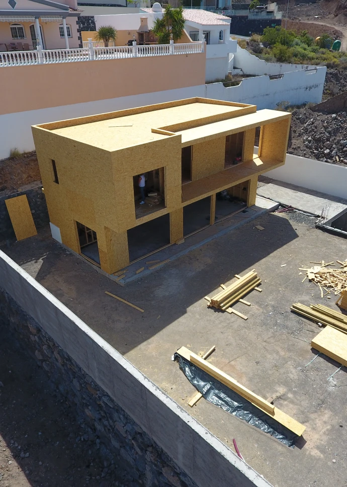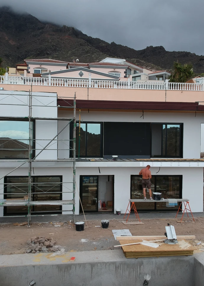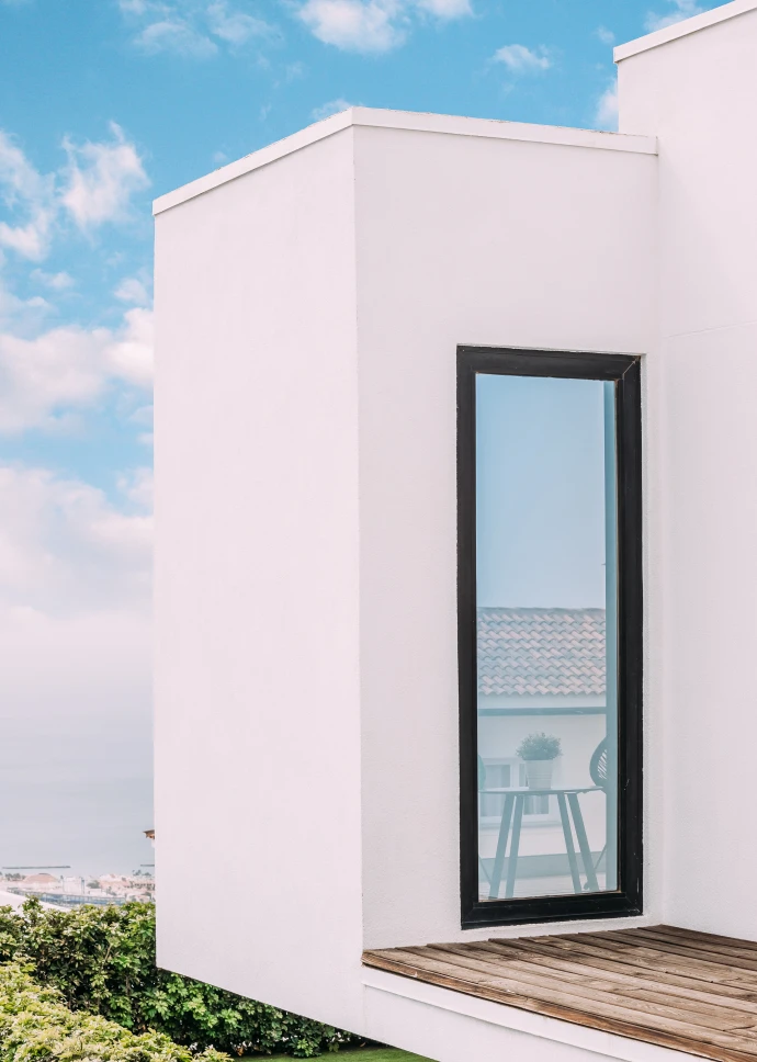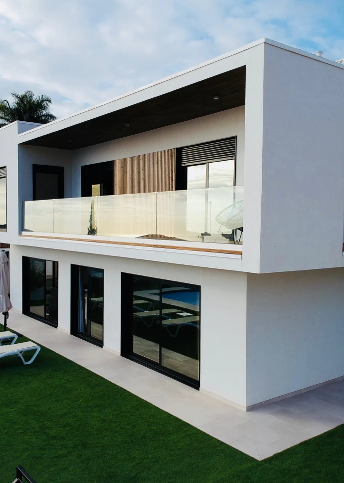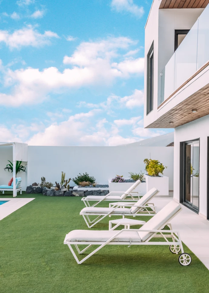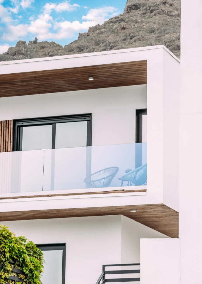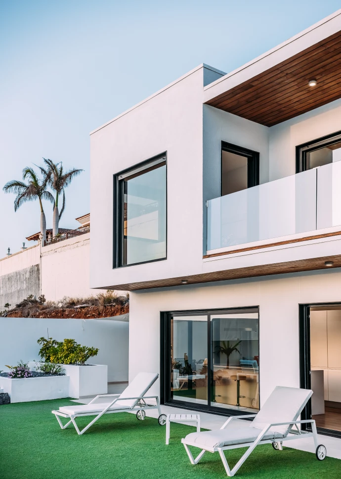 Esta preciosa vivienda unifamiliar de 140 m2, ubicada en la costa de Adeje, recibe la luz natural desde todos los ángulos gracias a sus grandes ventanales. Está construida en dos plantas, con una forma rectangular en planta baja y en planta primera, terrazas en voladizo y cubierta plana. Su fachada exterior está revocada en blanco con toques de rastrelados de madera.