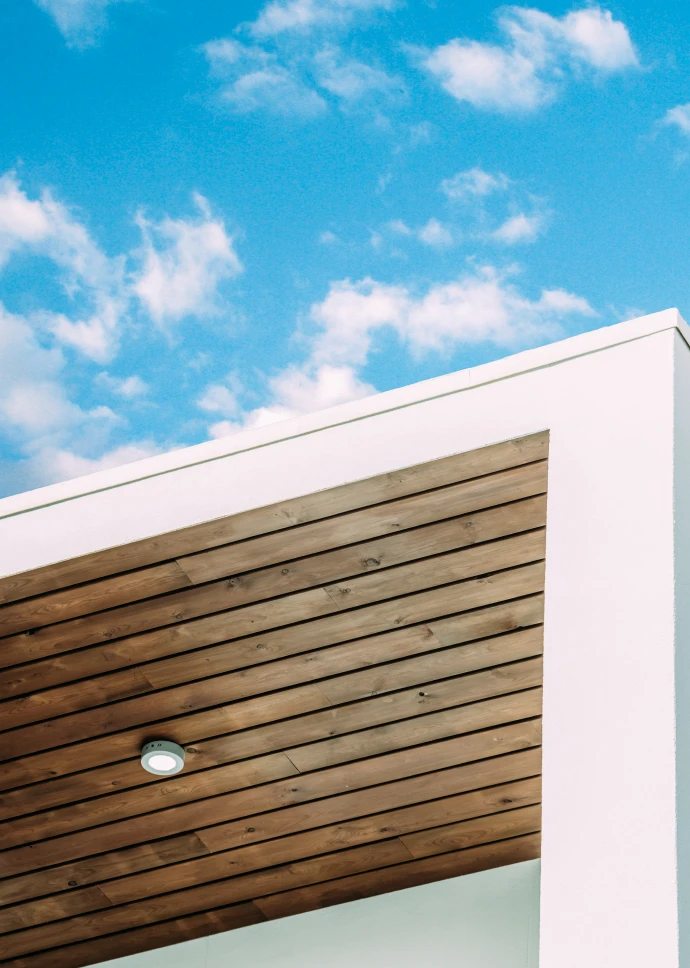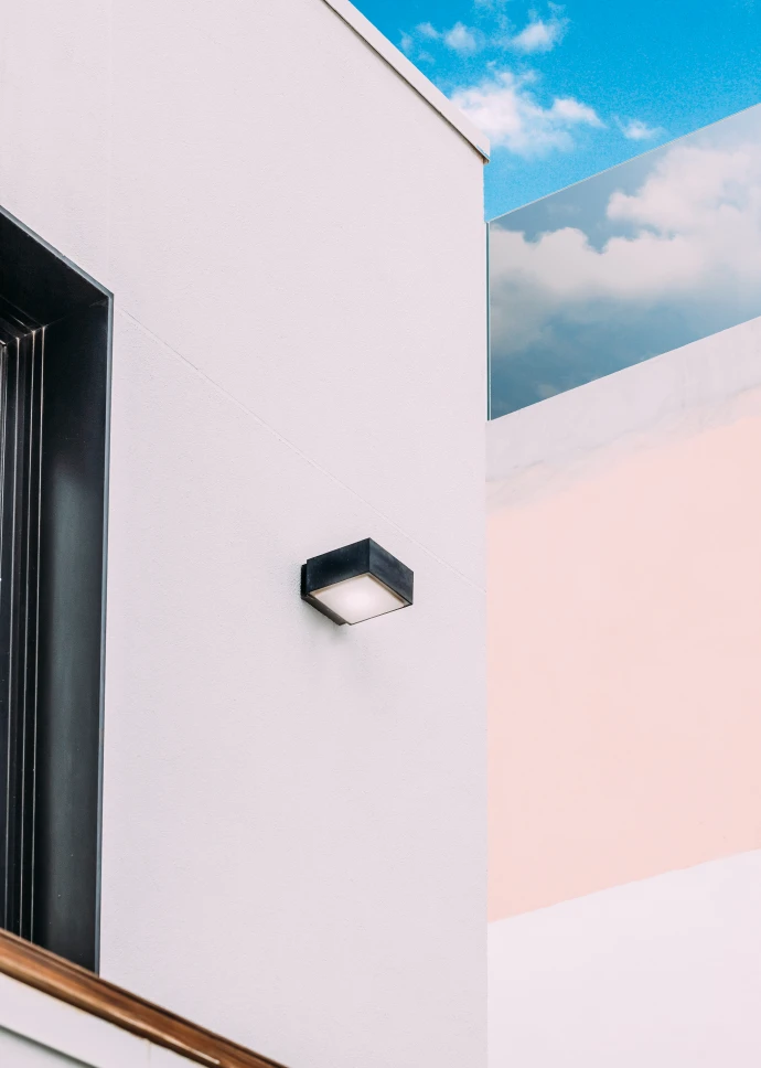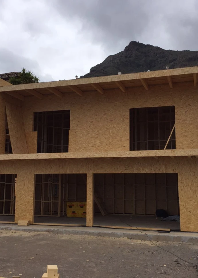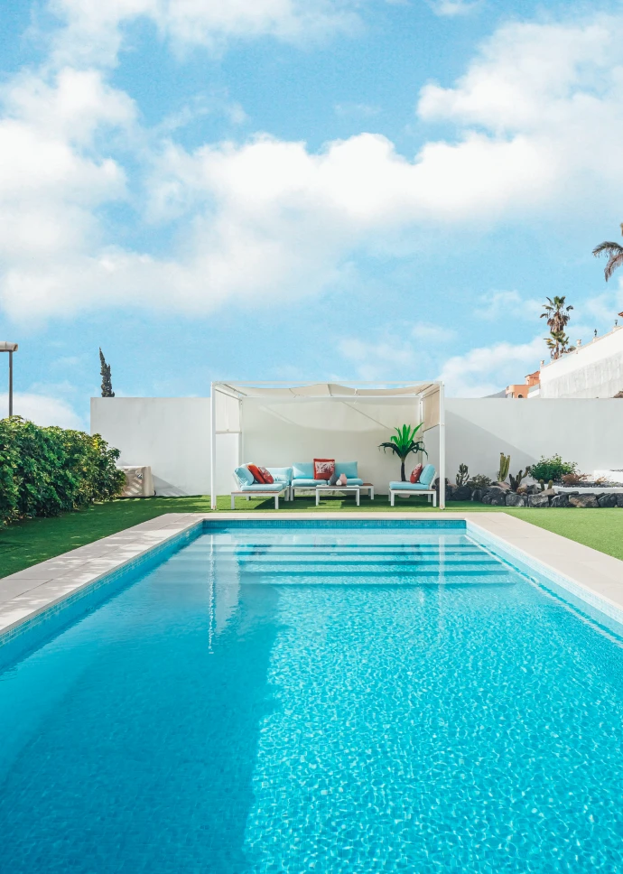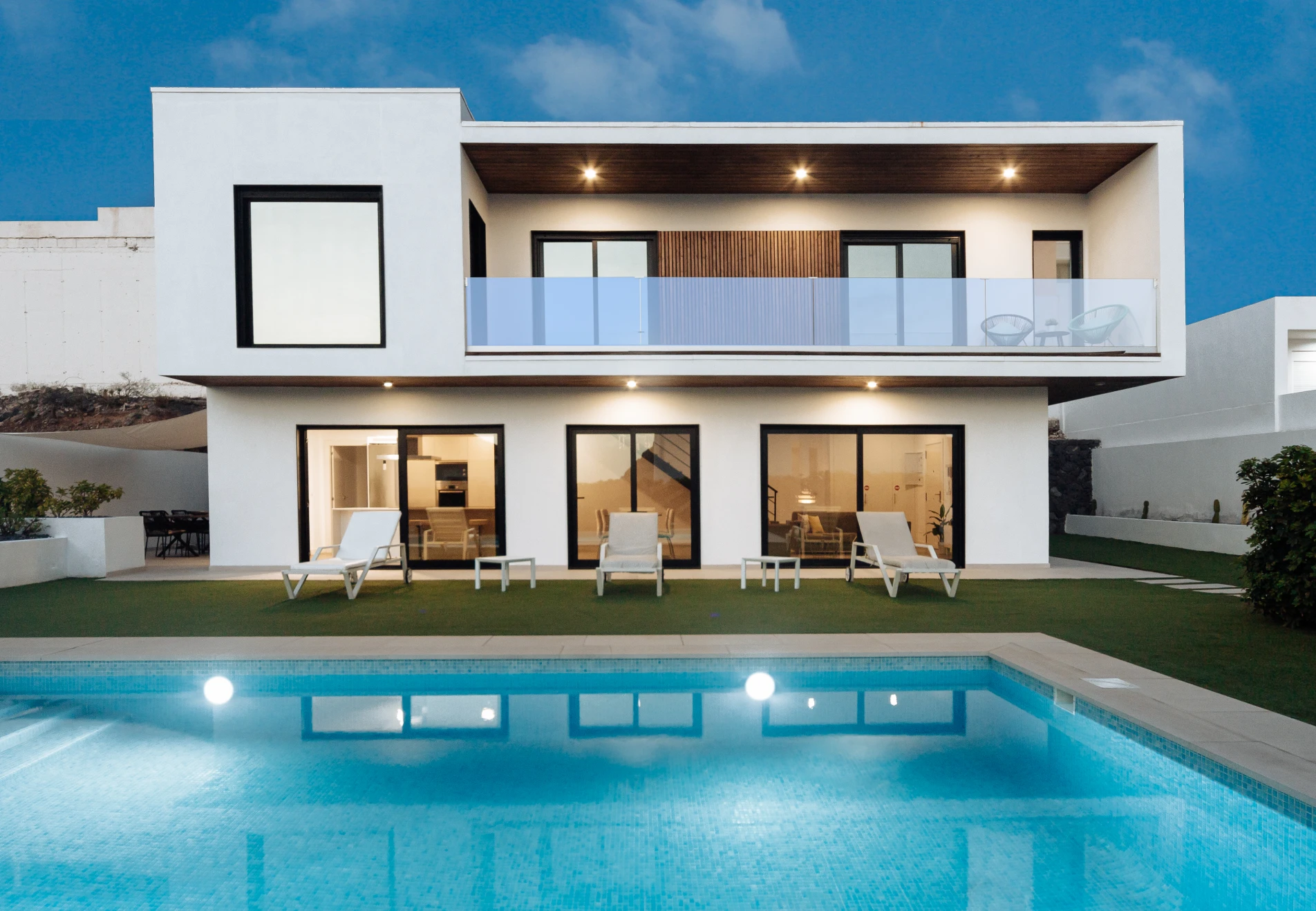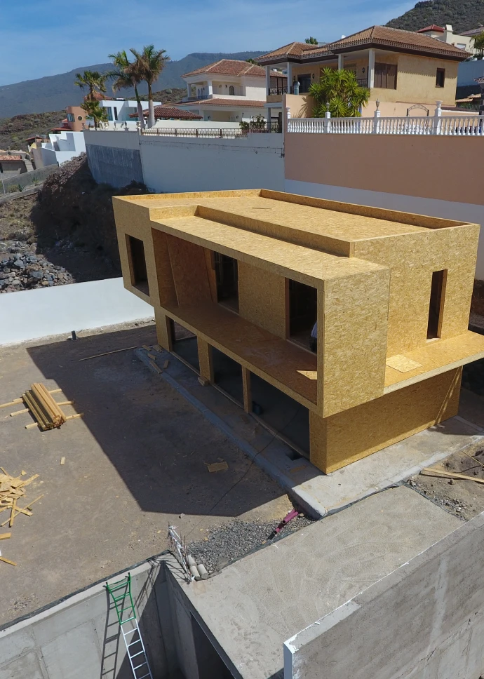 Esta preciosa vivienda unifamiliar de 140 m2, ubicada en la costa de Adeje, recibe la luz natural desde todos los ángulos gracias a sus grandes ventanales. Está construida en dos plantas, con una forma rectangular en planta baja y en planta primera, terrazas en voladizo y cubierta plana. Su fachada exterior está revocada en blanco con toques de rastrelados de madera.