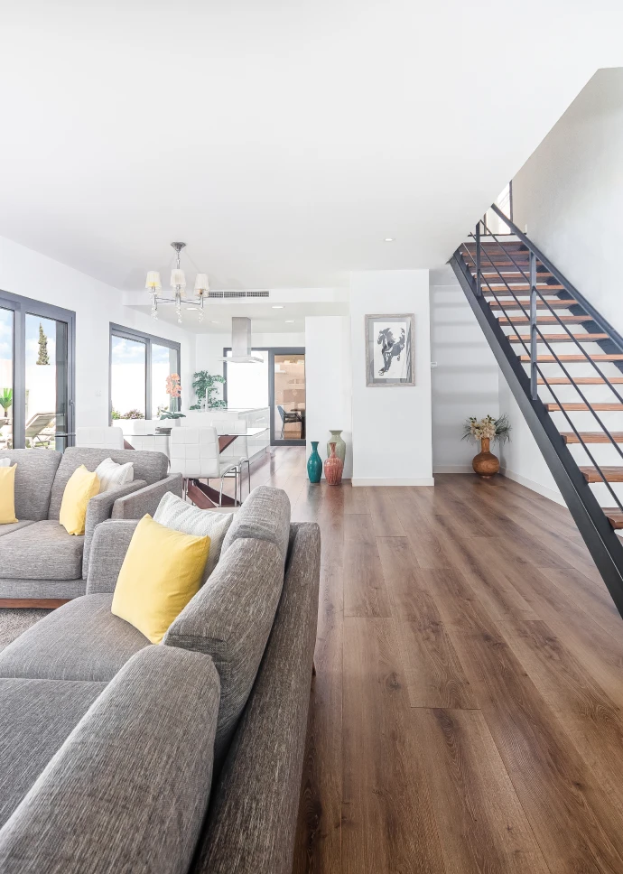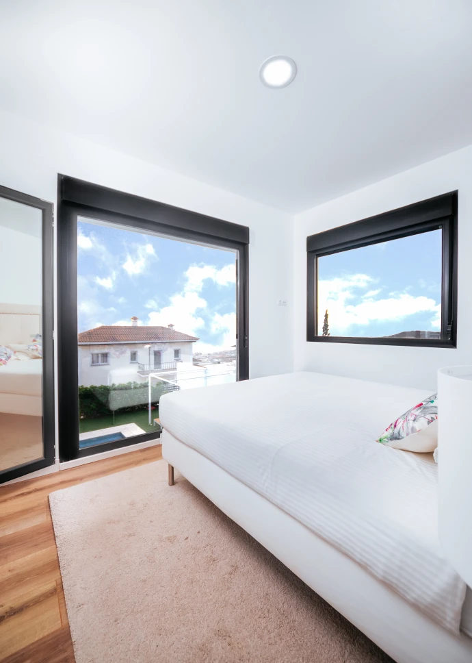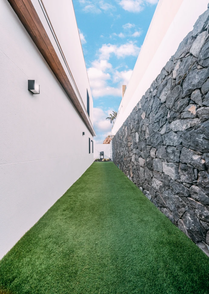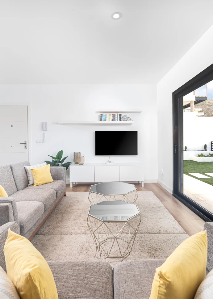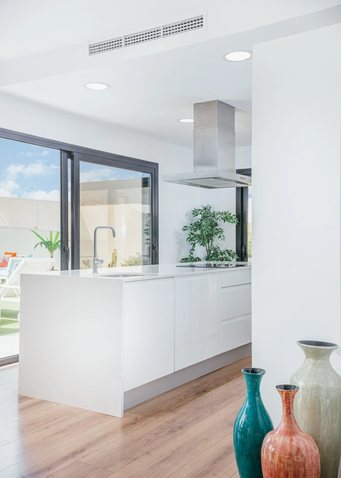 El diseño minimalista y moderno de la vivienda, junto con los materiales utilizados para el acabado, hacen que los espacios sean acogedores y cálidos, permitiendo a través de grandes cristaleras que el usuario disfrute de las vistas que ofrece la isla. Distribuida en dos plantas, cuenta con un amplio salón-comedor, cocina integrada con una gran isla central, tres baños, tres dormitorios y grandes terrazas. Sus espacios se caracterizan por ser luminosos, modernos y muy acogedores, ideales para cualquier estilo de vida.