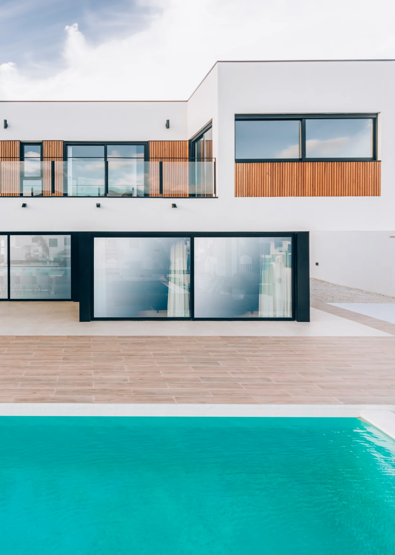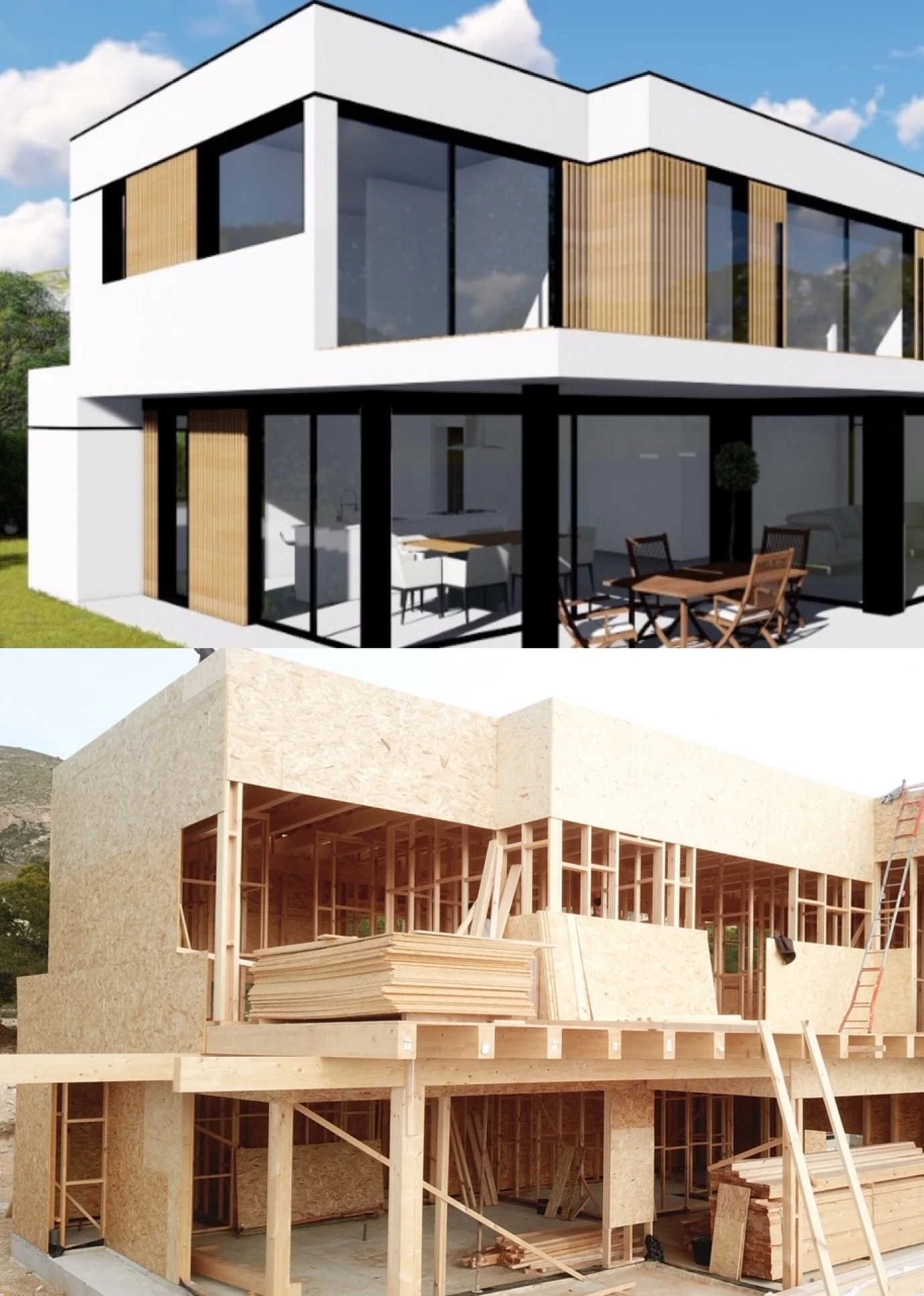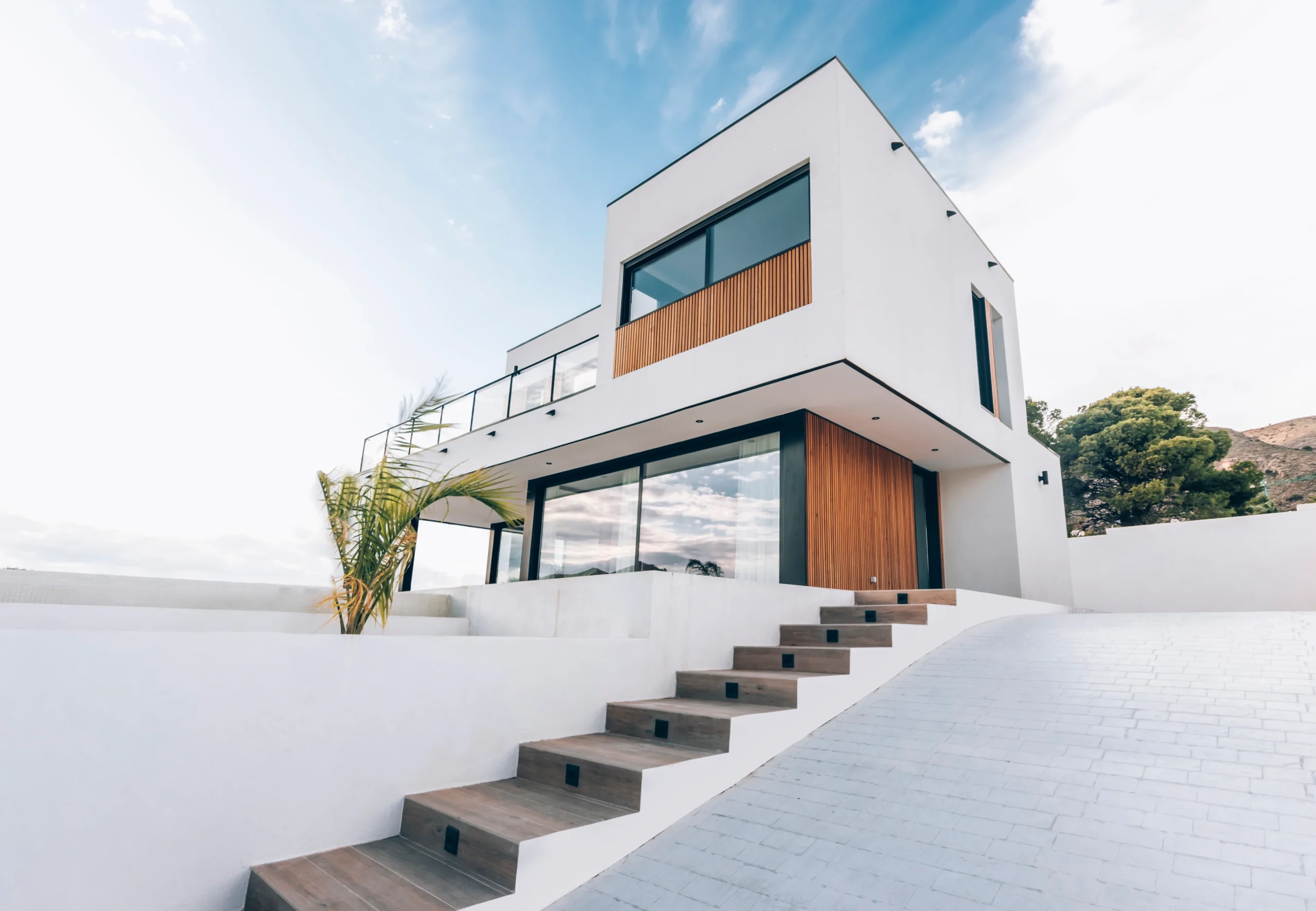 Esta hermosa vivienda, ubicada en el municipio de Finestrat, a tan solo 8 minutos de Benidorm, se caracteriza por su hermosa fachada que combina los materiales característicos del estilo LUMEK, SATE blanco y detalles en madera.